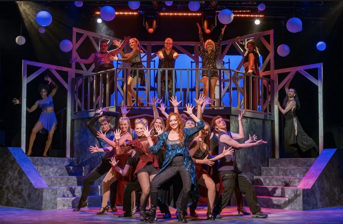 But oh, the dancing! Choreographer Vivian Romano once again fields an amazing array of dancers who don’t miss a step of Bob Fosse’s creative movements, with all sorts of interesting body angles and poses. Headed by dance captain and featured dancer Brycen Witt, who adds beautiful balletic shapes to the scenes, the cast members keep the story at a hasty clip through dance. With flips and other gymnastics, lighted “swords” and other props, every number is full of fun and surprises.