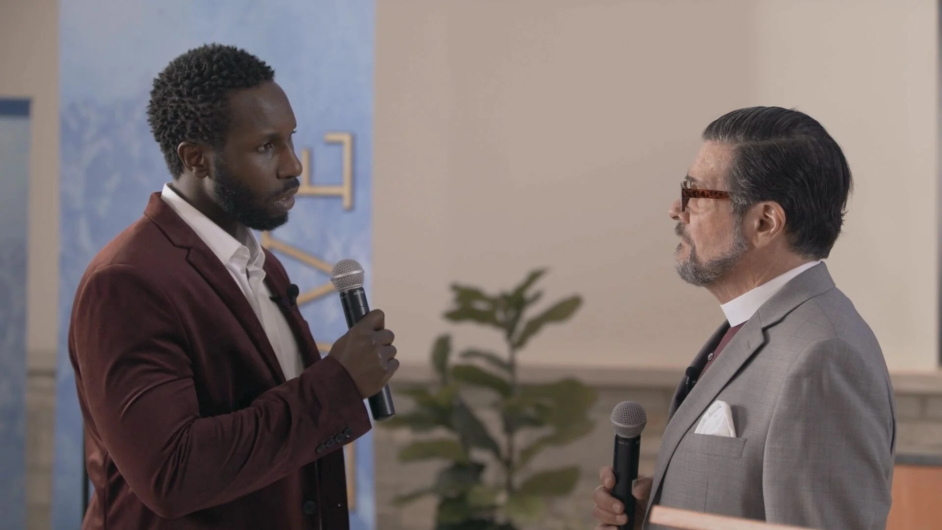 Associate Pastor Joshua (Andrew Muwonge) speaks with Pastor Paul (David Cecsarini) during a service in a scene from Next Act Theatre’s “The Christians.”